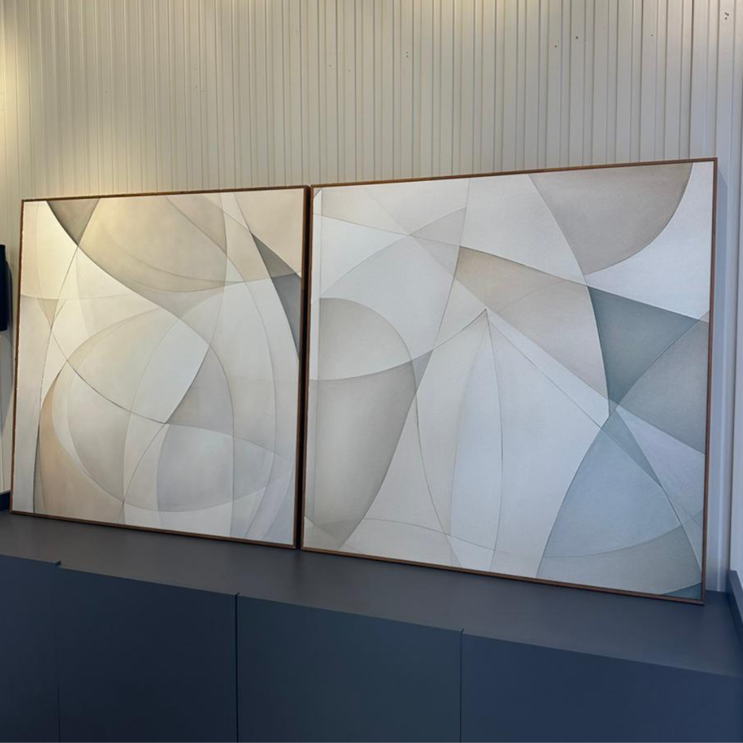 Conjunto com 2 quadros decorativos Abstrato Neutro. Medida 0,90x0,90cm cada Canvas com moldura filete freijó