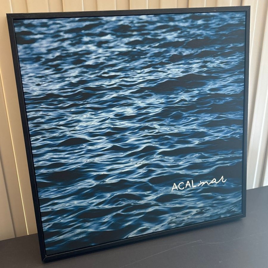 Quadro decorativo Mar com bordado ACALmar 0,35x0,35. Tela em Canvas Fineart e moldura filete preta preta.