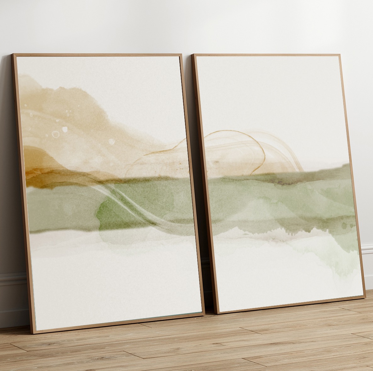 Conjunto de quadros linhas e onda abstrata verde e bege .