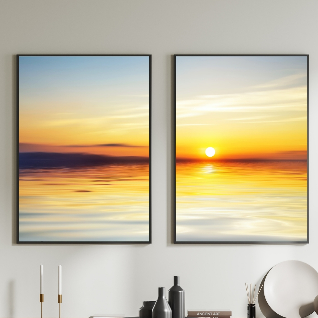 Conjunto de 2 Quadros Decorativos Mar com sol ensolarado.