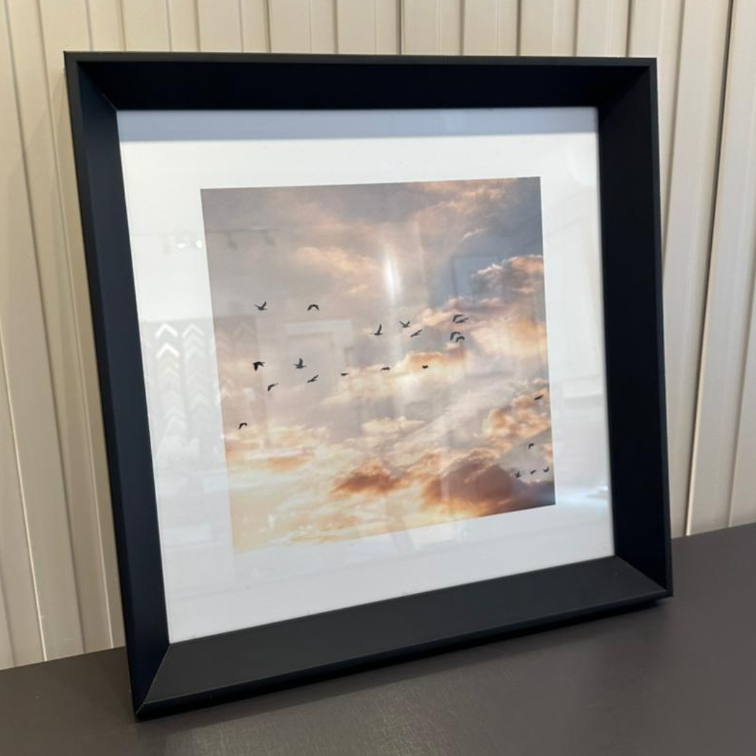 Quadro Decorativo Pássaros - 40x40cm com moldura chanfrada preta e vidro incolor.